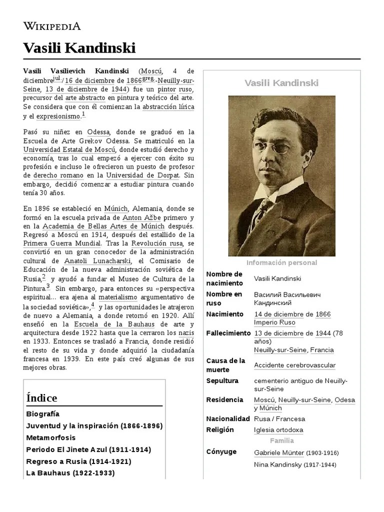 Cuando cumplió los treinta años, kandinsky abandonó la docencia y fue a estudiar pintura a munich, renunciando a un porvenir académico ya consolidado. Cada noche su tía le contaba cuentos y leyendas de la antigüedad y de su ciudad, moscú. 16/10/2018 · biografía de wassily kandinsky resumen el 16 de diciembre de 1866 nació wassily kandinsky, en el seno de una familia de clase media. Su familia era de estatus alto, su padre vasíli silvéstrovich kandinsky se desempeñó como comerciante de té de kiajta, la madre de su padre hacia parte de la aristocracia mongol y hacia parte de la dinastía gantimúrov. 14/6/2017 · biografía de vasili kandinski indice temático: